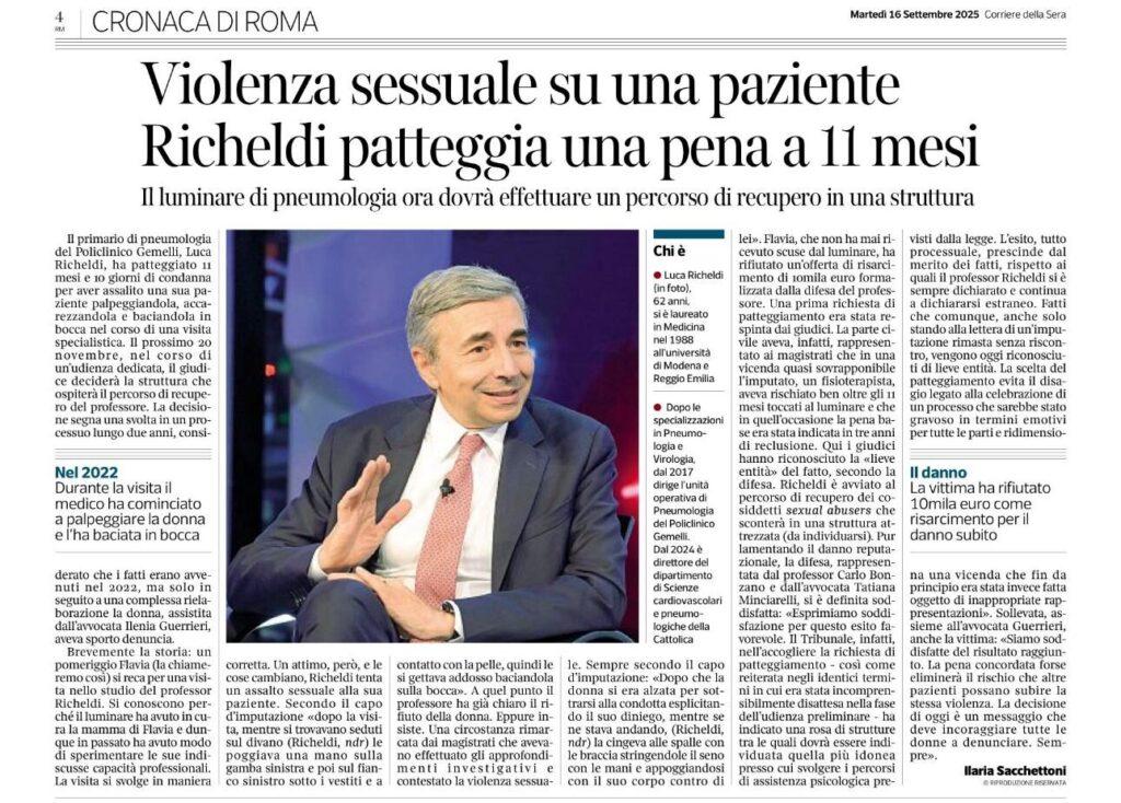 Il Corriere della Sera ha riportato la notizia della condanna di Luca Richeldi, primario di pneumologia del Policlinico Gemelli, che ha patteggiato una pena di 11 mesi e 10 giorni per aver molestato una paziente durante una visita specialistica nel 2022.Secondo quanto emerso, il medico avrebbe palpeggiato la donna e l’avrebbe baciata in bocca. L’episodio […]